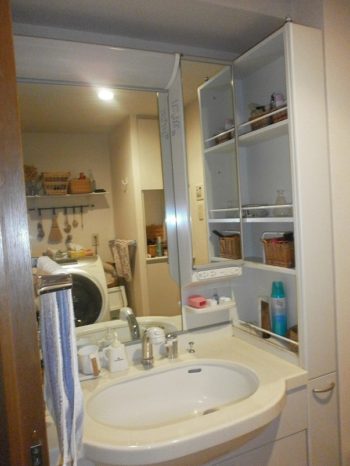 【洗面室】育ち盛りの息子さんがお二人の、部活動で持ち帰る泥汚れの予洗いや洗顔の際の水はね等々、気になる点が多い洗面室。