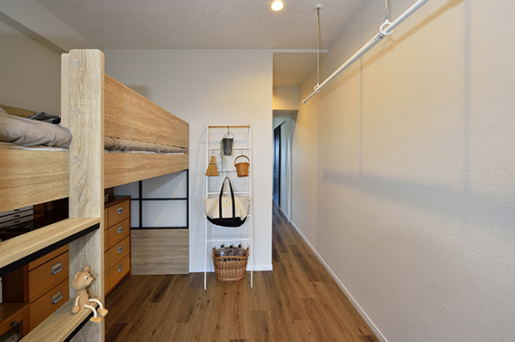 【洋室②お子様(長男)の部屋】それぞれの部屋の建具を開放する事で、南北にかけて風が流れる設計に。