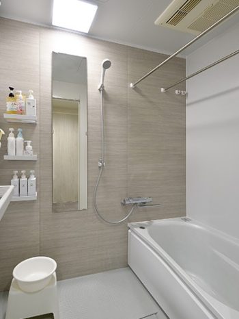【浴室】お手入れもしやすい、すっきりとしたデザインの浴室に。洗濯物を干せるように、ランドリーパイプを2本設置しました。