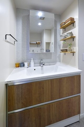 【洗面室】意匠性と水はねへの清掃性を考え、正面はモザイクタイル貼りに、両サイドは化粧パネルを貼りに。飾り棚で見せる収納&ミラー裏収納で隠す収納に。