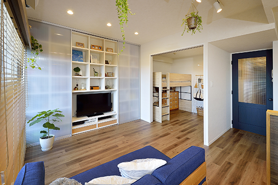 | プラン決定のポイント工夫 | 高校・大学受験を控えた2人の息子さんと猫ちゃんがいらっしゃるKさん。『日中は、間仕切りを開けることで、風を通し、猫ちゃんも自由に動き回れる広々空間として使用。夜は、各々が個々の部屋で仕事や勉強に集中しつつ、ホッと一息つきにリビングに集まる。』そんな空間になりました。 洋室②③の間仕切りには、上吊り式のノンレールの3枚引違い戸を採用。将来的にお子様が独立された後は扉をはずすだけで、大空間として使用できます。 |