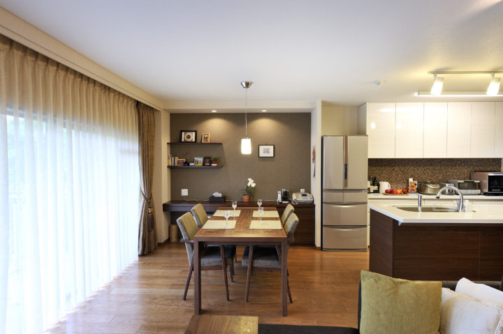 バルコニー越しに眺望を楽しめるキッチンに仕上がりました。壁の一部(写真正面)にはシックなアクセントカラーを採用して、お洒落な小棚を設置しました。ミニ書斎コーナーとして活用されています。