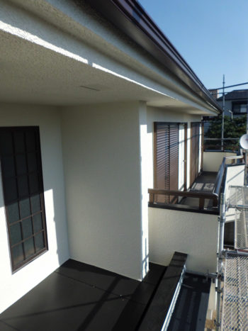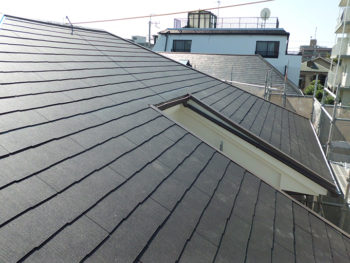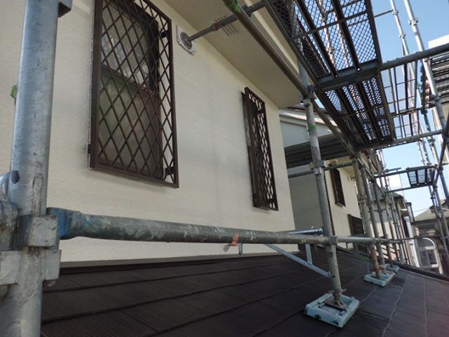 | 施工内容 | 足場組立、高圧洗浄、外壁シリコン塗装ローラー塗り、樋水切りウレタン塗装、既存瓦撤去工事、遮熱/防水シート敷き、屋根吹替工事、棟金物取付工事、谷板板金加工取付工事 |