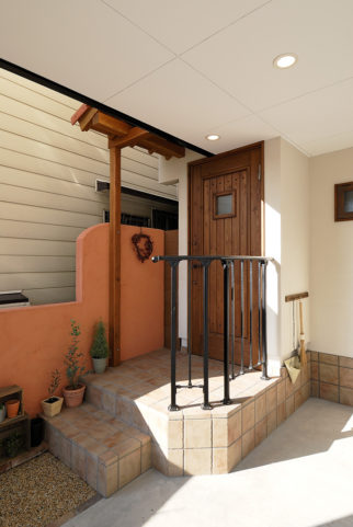 玄関ドアはYUDA木工製のカントリーデザイン調を採用し、同時にガーデニング感覚でアプローチを演出し、まるでお店のようになりました。