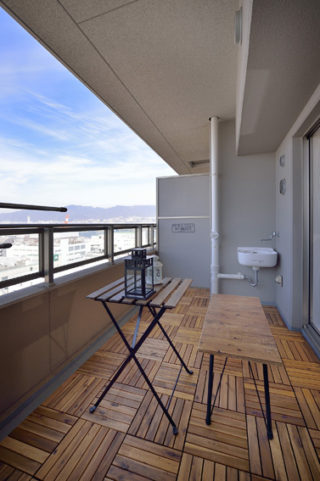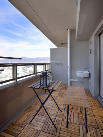 【バルコニー】元々ダイニングで使用していたテーブルをDIYでベンチに!ウッドデッキを敷いて、お洒落なバルコニーに。