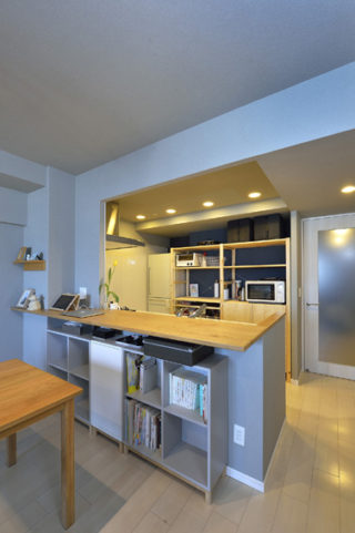 【LDK】キッチンカウンターはインテリアに合わせてオーダー作成(造作)。カウンター上には水切りカゴやパソコンを、カウンター下には本棚等々を置かれたいとのご希望で、奥行は深くしました。