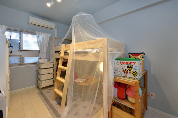 【子ども部屋】子ども部屋の壁紙はお子様ご自身でお選びに。ベッドには天蚊帳もつけて気分はプリンセス!
