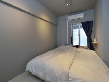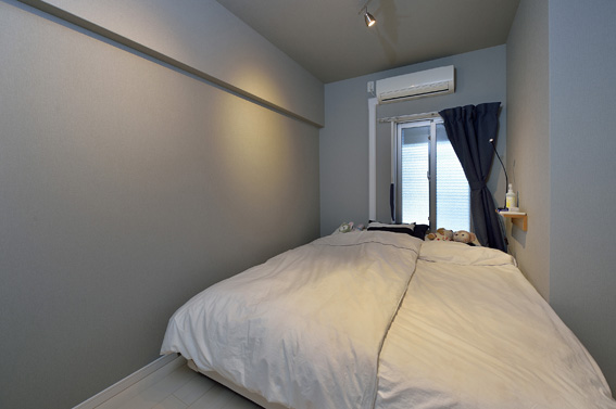 【寝室】天井、壁共にグレーの壁紙にした事で、落ち着いた雰囲気の寝室に。
