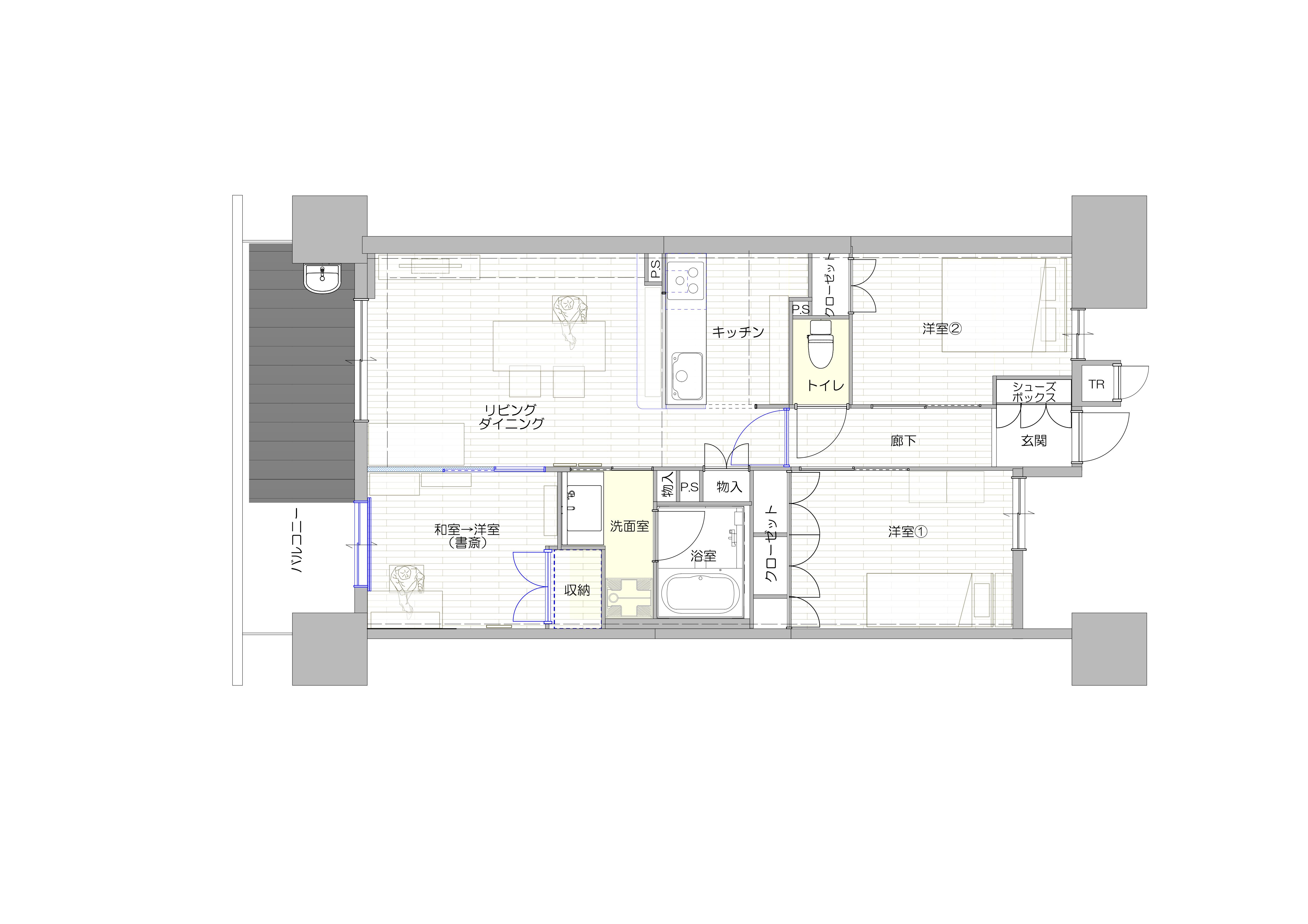 | プラン決定のポイント工夫 | 和室を洋室へ変更し書斎に。キッチンの吊戸と垂壁を撤去し、開放感のある空間になりました。大きな間取り変更や設備の取替はせず、壁紙やインテリアで雰囲気を一新。オシャレな空間になりました。 |