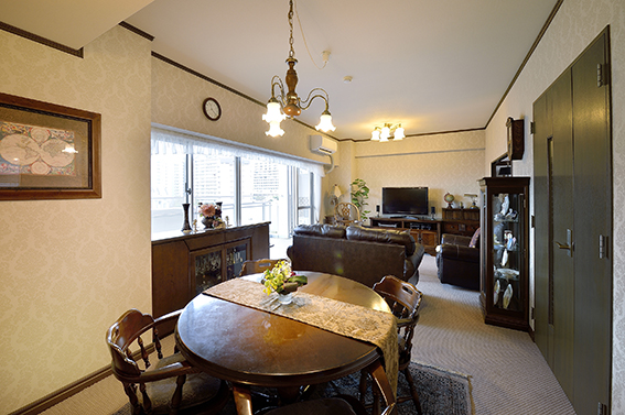 廻縁がアクセントに。お手持ちの家具や照明と、内装が絶妙にマッチしました。