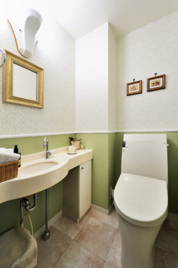 キッチンを広げるために、少し小さくなったレストルームでした。設備機器は以前のままで、内装のみを変更しました。洗面室とお揃いの石畳風床材、装飾モールを境に2種類のクロスを使い、既存の設備ともぴったりとあった爽やかなレストルームになりました。