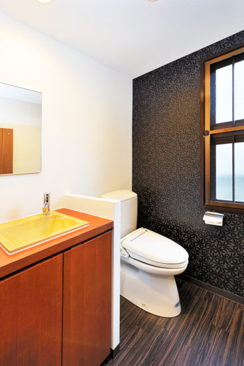 お客様使用がメインの1Fのトイレはアクセントクロスが広い空間を引き締める役割をしています。造作の手洗いはこの空間をよりラグジュアリーに見せる効果を生んでいます。