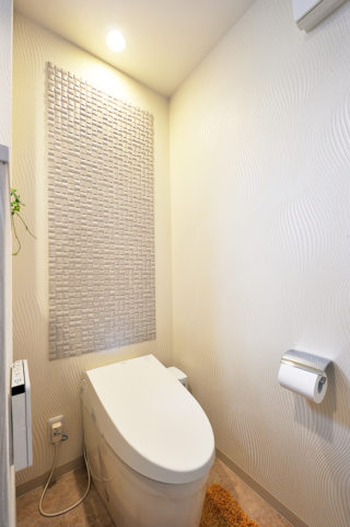 タンクレスのトイレと一面鏡の洗面化粧台がすっきりとした美しさを演出し、トイレの後ろに張ったエコカラットタイルはその存在感で機能と共に、冷たい印象になりがちな洗面所に適度な重みと暖かみをプラスしてくれます。