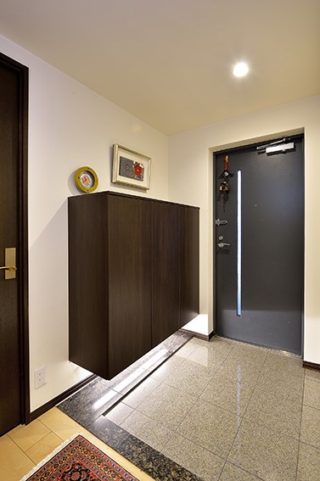 【玄関】フロートタイプの玄関収納と、間接照明の効果で、明るく広い印象の玄関に。