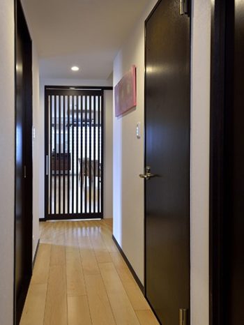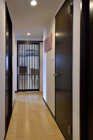 【廊下】出来る限り引き戸を採用する事で、通風と生活動線の安全性を確保。
