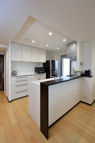 【LDK】シンプルで直線的なキッチンのデザインに合うように、キッチンカウンターを造作し、ダークカラーが空間の引き締め効果に。