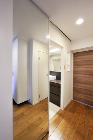 洗面化粧室入り口の引き戸は、壁に同化するような天井ジャストのハイドアでお洒落に演出。ミラーによって、廊下や玄関まわりが広く感じられる効果もあります。