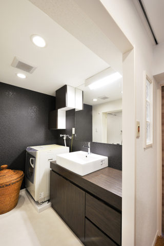 洗面化粧台は、お好みのデザインに造作。建具や壁紙の色や質感にもこだわり、ホテルライクな上質空間となりました。