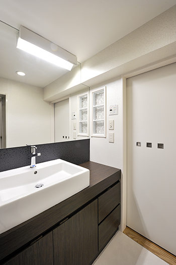 ワイドサイズのミラーやガラスブロックの明かり採りを取り付けて、浴室と統一感を持たせました。