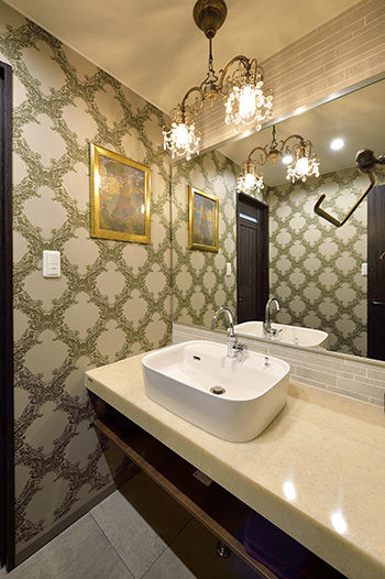 女性専用の化粧室はエレガントな雰囲気に仕上げました。化粧台前のタイルは優しい色合いを採用し、クロスは逆に大柄なダスマスク調にすることで、大胆ながら調和のとれた空間となりました。