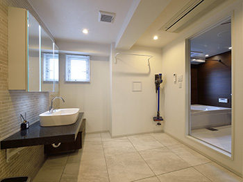 広々とした洗面脱衣所はS様のプライベート空間として、白を基調に優しい色合いのタイルを使い、清潔で落ち着いた空間に仕上げました。