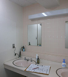 いかにもオフィスビルの従業員用といった雰囲気のトイレ洗面スペースで、来客のおもてなしの雰囲気とはかけ離れた空間でした。