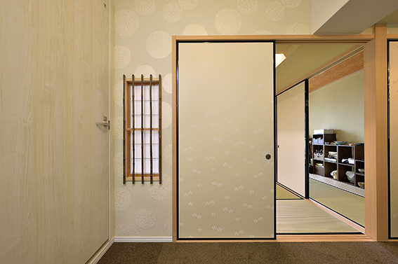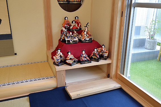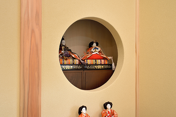 [円窓]押入れの段差を利用し、飾り棚を造作。内部には小棚を設け、季節の飾りなどに活用。