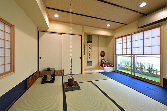 | プラン決定のポイント工夫 | ・二間続きの和室を八畳席と二畳+板の間の控え室という間取りに変更し、押入れは半分にして床の間を作りました。 ・八畳席を確保するためにホール側の間仕切り壁を後退。半埋め込みタイプの置き炉を採用し、カーペット敷きのホールとの床レベルを揃えるなど、主人や客人がスムーズに動けるように配慮したのも特徴です。 |