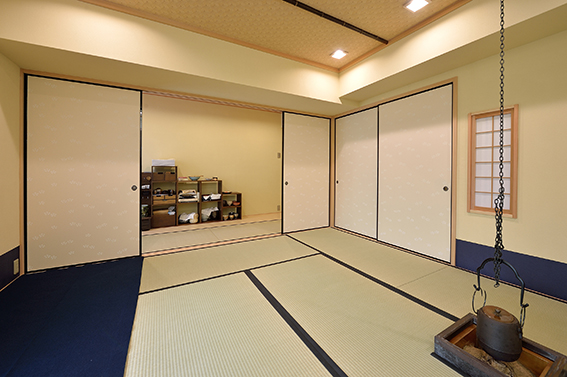 [八畳席より控え室の眺め]控え室はあえて簡易的なスタイルとし、襖の間仕切りによって茶室と区分。控え室には本格的な水屋を設けるのではなく、一部をフローリング敷とし、シンプルな家具を配置。マンションの特性も鑑みた上、機能的で新しい茶の湯空間を実現。