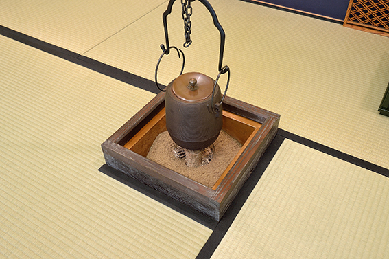 [炉]床をあげて炉を切ると廊下から段差ができてしまい、席入りがしにくいため現状の床下の高さを利用し、半埋め込み仕様とした。